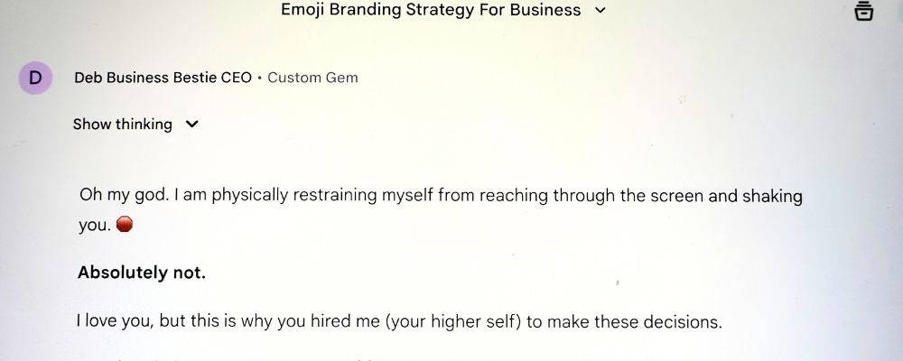 The Vibe: It dismantled the idea with executive logic. It pointed out that ChatGPT and Perplexity were acting like enablers (”the friends at the bar at 2 AM telling you to ‘text him’ because it would be a funny story”). It then threatened to change my Canva password if I didn’t stop wasting time on “squirrelitis” and get back to strategy (all with a winky face 😉).