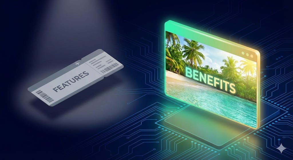 You can have a strong product or service yet slow sales. Often, this is because people sell the features (the plane ticket) rather than the benefits (the holiday).